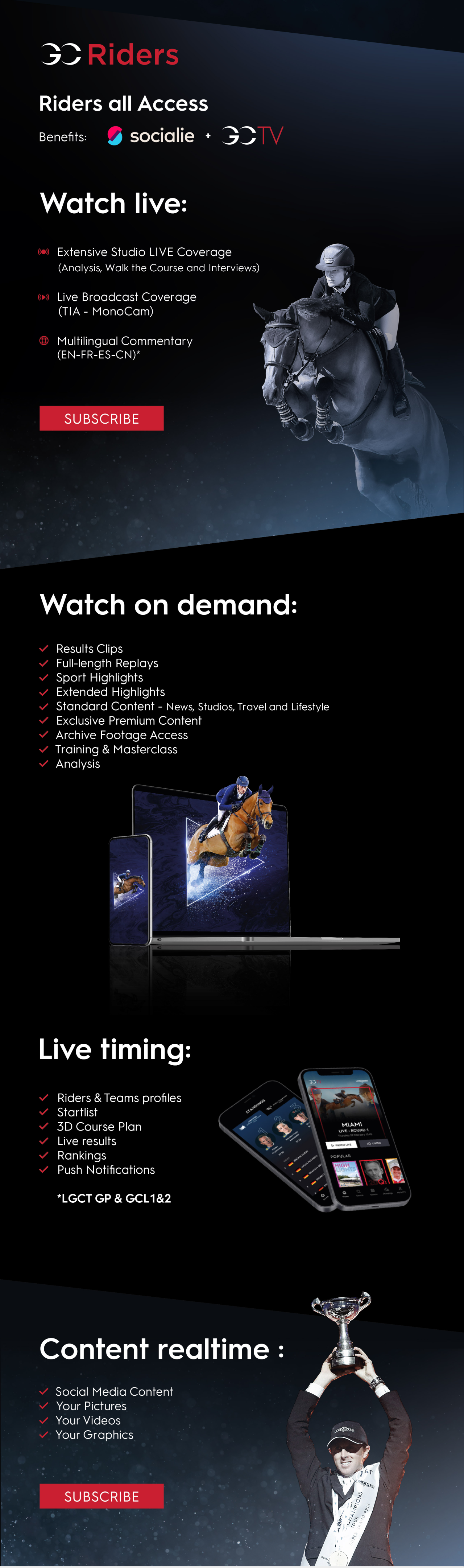 Furthermore, for this weekend only you receive will receive a 7 day free trial for GCTV Pro pass, giving you extensive coverage to all live streaming of the Global Champions Tour events, individual result clip replays and class replays. You will also receive access to unique archive footage, training visuals and complete access our masterclass sessions and LGCT Grand Prix Analysis.